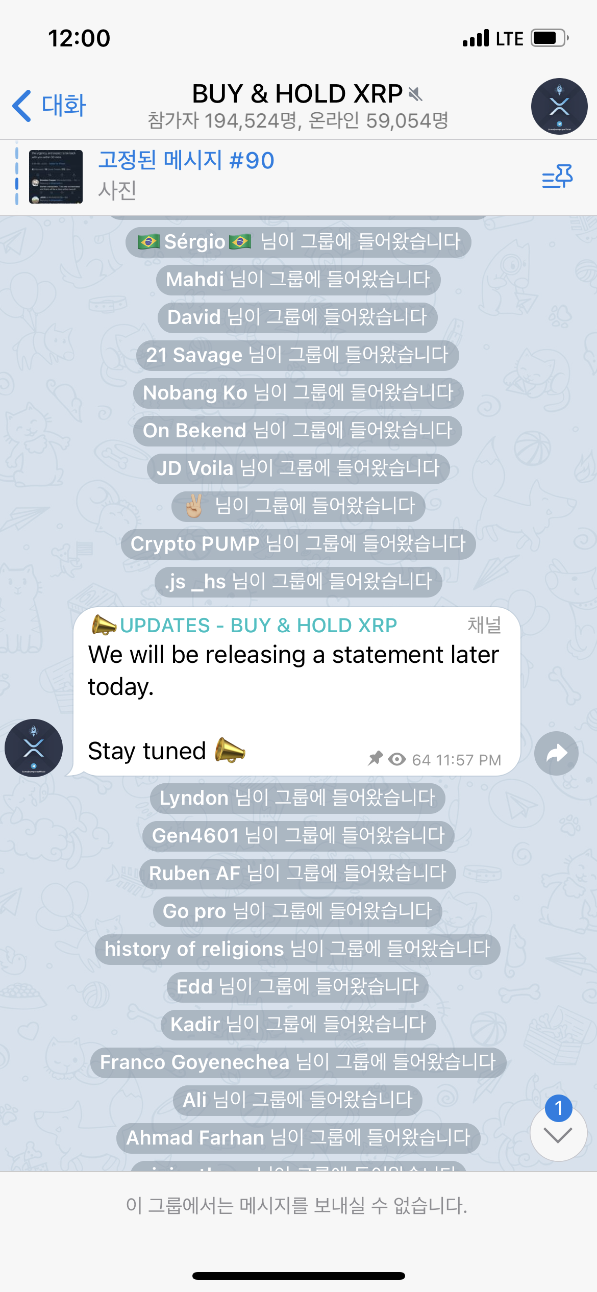 리플도 20만명이 모인 텔레그램 리플방 소식으로 갑자기 이틀동안 300원대에서 800원대로 펌핑
