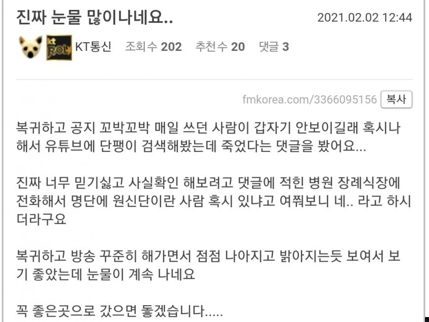 어제 갑자기 단팽이님이 돌아가셨다는 글이 올라오고