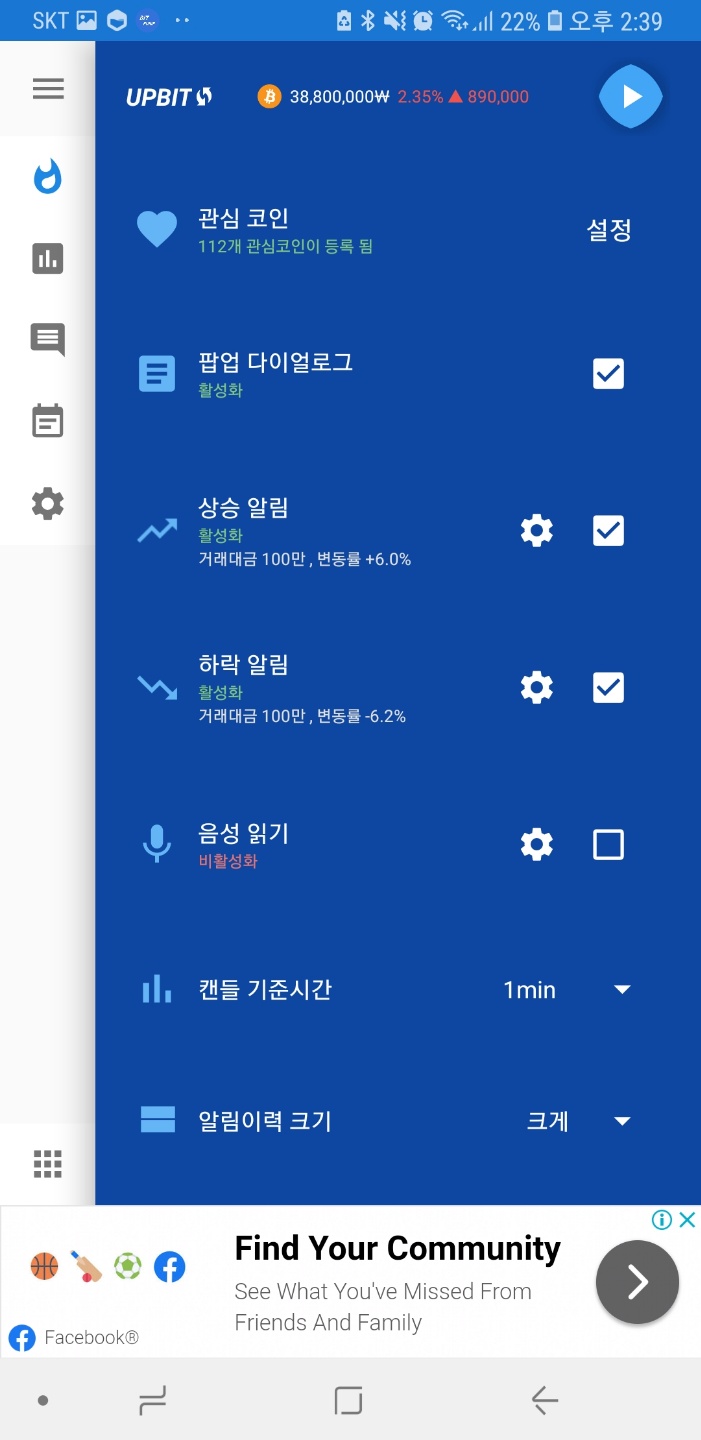 이어플은 업비트나 빗썸 코인들의 급등과 급락을 퍼센트로 설정해서 알림을 받을 수 있습니다.
