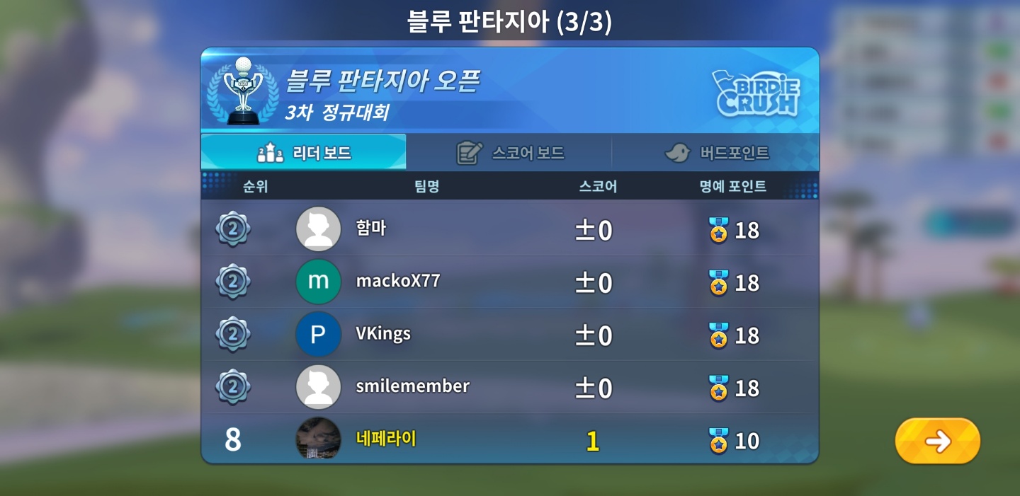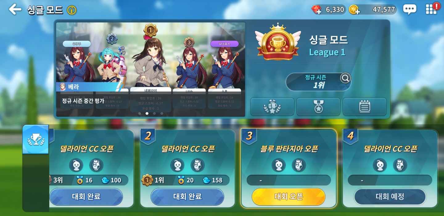 개인 싱글모드는 3개의 캐릭터를 선택해서 1홀부터 3홀까지 돌면 경기가 끝난다.