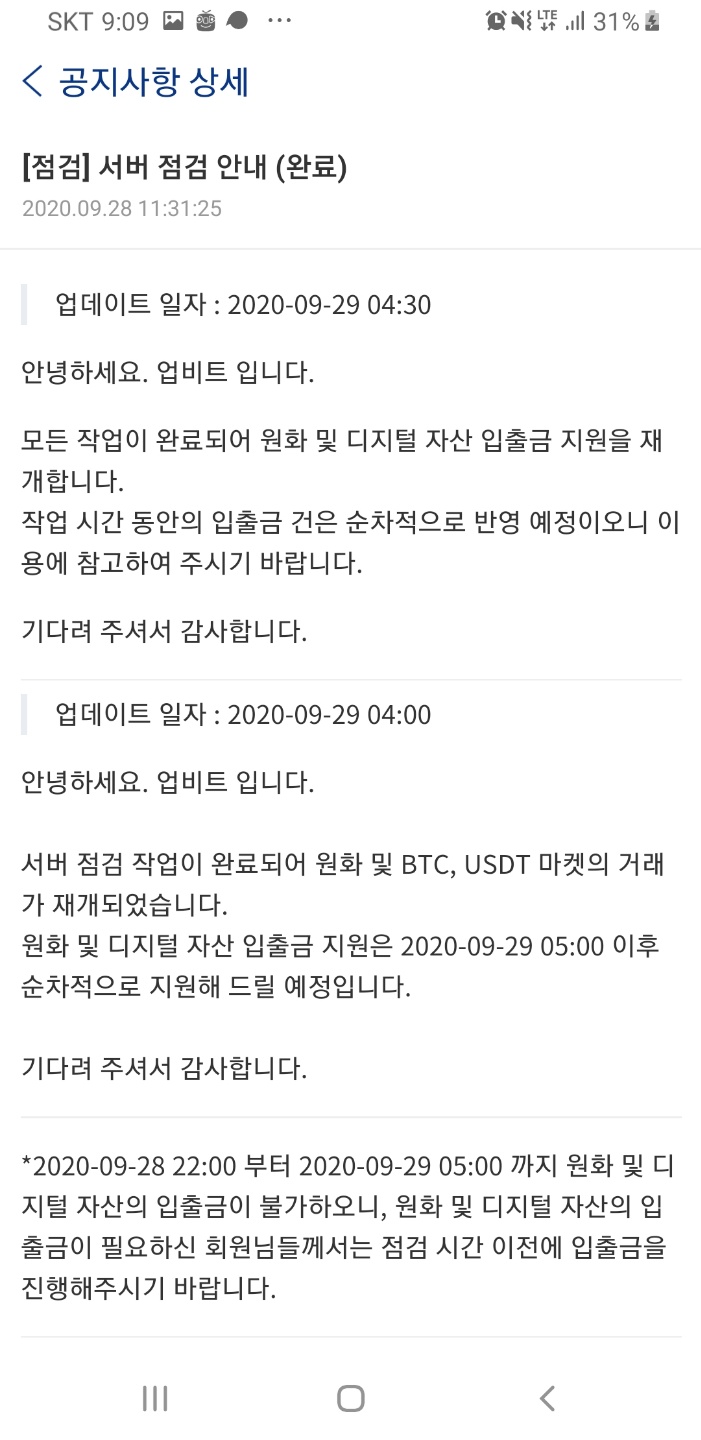 15일 새벽에 업비트 원화마켓만 서버점검에 들어간다고 한다.
