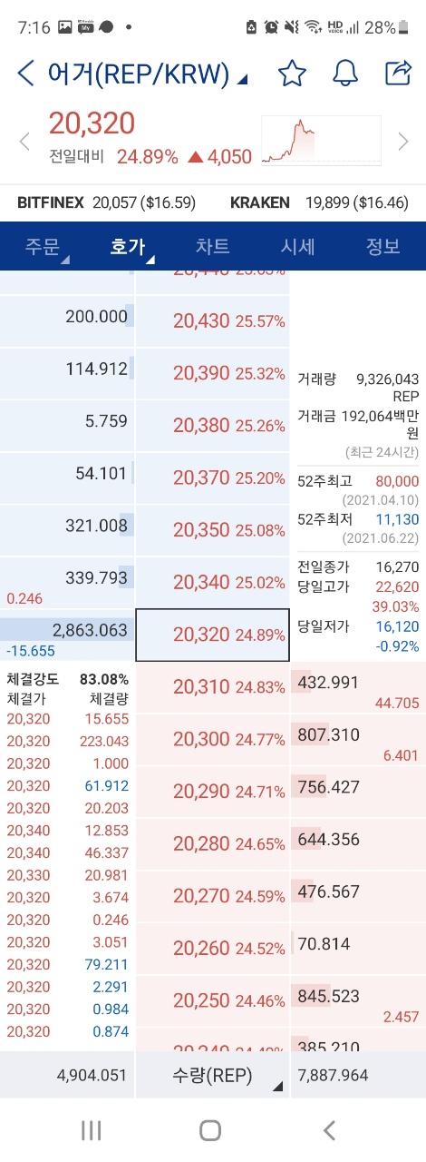 어거는 순간적으로 40%가까이 상승했다가 떨어지는 중인데
